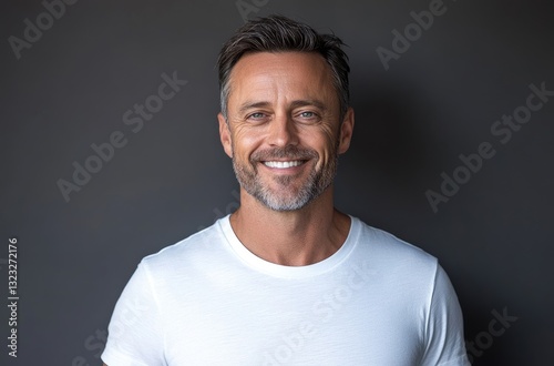A smiling middle-aged man with short hair and a goatee, wearing a white T-shirt, in a studio portrait against a grey background.