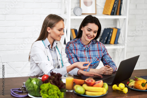 A smiling nutritionist advises a young patient woman on proper nutrition and dieting. The doctor shows in laptop a scheme of weight loss without a bad effect on health.