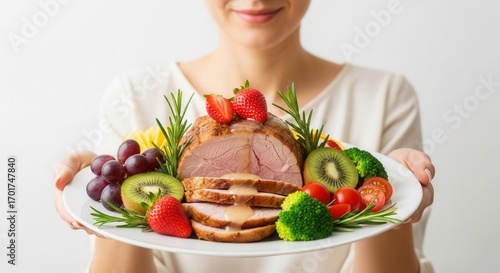 meat, roast, sliced, gravy, plate, food, meal, dish, platter, hand, person, smile, fruit, vegetable, strawberry, kiwi, grape, broccoli, tomatoes, rosemary, garnish, healthy, fresh, delicious, savoury, sweet, dinner, lunch, feast, celebration, cookery, culinary, epicure, cook, serving, presentation, white, background, bright, studio, mealtime, nourishment, eating, holding, festive, abundance, variety