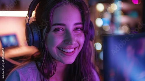 a smiling white young woman with shiny black and blod hair on her computer in a streamer room
