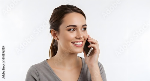 A smiling woman with brown hair in a ponytail is talking on a smartphone against a white background