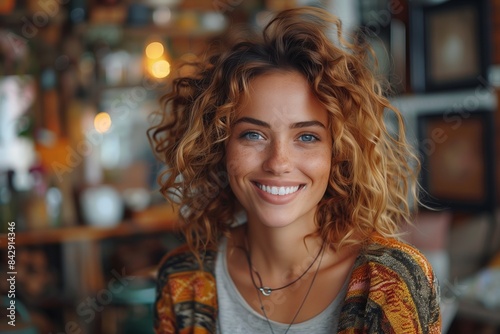 A smiling woman with curly hair works at home. She is wearing a casual sweater and necklace