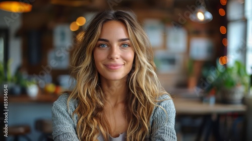smiling woman, wavy hair, blue eye, welcome, positivity, warmth, friendliness, comfort, modern, portrait, realistic, soft light, indoor, smile, radiance, serene, politeness, femininity