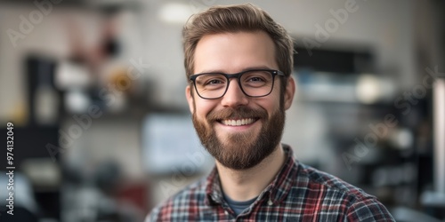A smiling young man wearing glasses and a plaid shirt poses happily in a modern workspace. His friendly expression adds warmth to this professional environment. AI