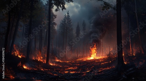A smoldering forest after a fire, with lingering smoke and scorched earth as nature begins to recover.