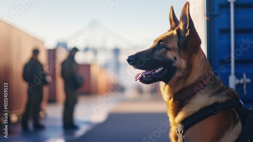 A sniffer dog working with customs agents at a shipping yard, with shipping containers blurred in the background