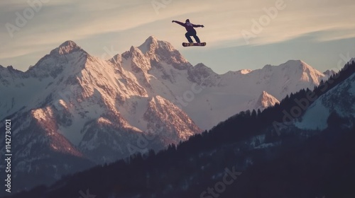 A snowboarder leaps against a backdrop of majestic snow-capped mountains at sunset.