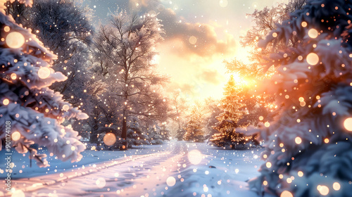 christmas, new year, holiday, winter, forest, snow, tree, path, sunset, gold, hours, snowflake, new, year, illustration, rendering, tree, snowfall, vintage, style, landscape, beautiful, magical, atmosphere, light, warm, cosy, festive, december, celebration, nature, serene, peaceful, calmness, soft, delicate, sparkle, glistering, bokeh, frost, ice, glacé, white, blue, orange, yellow, brown
