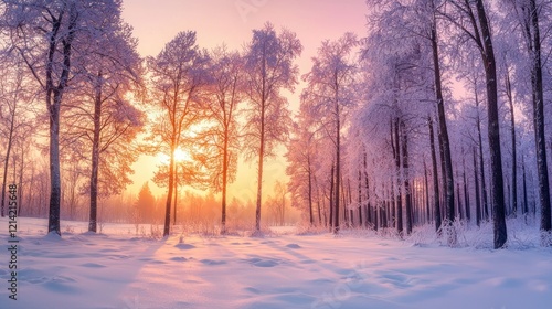 A snow-covered forest with frost-covered trees and a peaceful winter sky, capturing the beauty of winter nature