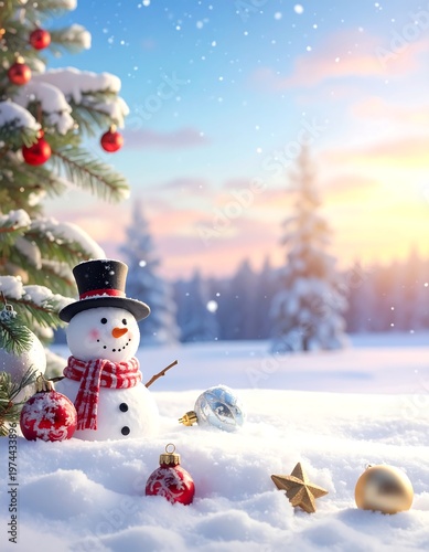 snowman, tree, snow, winter, christmas, decoration, ornament, festive, cold, scene, landscape, sunset, sky, blue, orange, pine, forest, snowflake, hat, foulard, carrot, coal, stick, arm, red, black, gold, silver, star, bell, present, season, holiday, joy, fun, chill, frosty, icy, serene, peaceful, beautiful, rural, outdoors, nature, environment