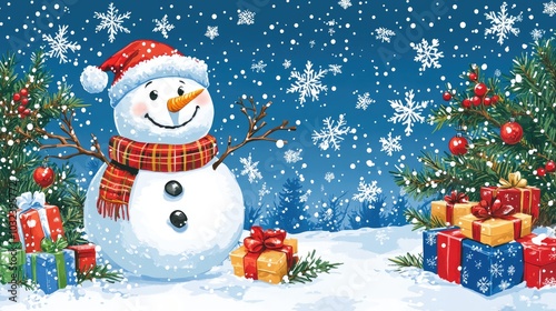 A snowman with snowflakes, gifts and mistletoes, the scene should be on the side and use the colors of Christmas