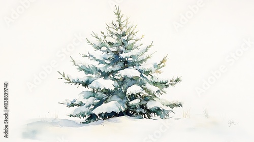 A snowy evergreen tree stands majestically in a winter landscape surrounded by gentle white snowflakes in a serene, quiet environment