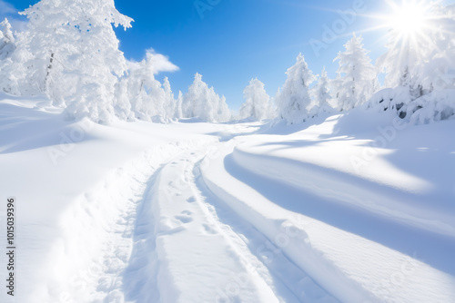 snow, winter, landscape, blue, sky, sunlight, tree, pathway, outdoors, cold, season, hiking, nature, serenity, calmness, cloud, fresh, bright, scenic, panoramic, footpath, environment, beauty, weather, adventure, flora, wilderness, tranquil, scene, brightness, icy, frost, morning, afternoon, clear, peaceful, exploration, travel, rural, route, natural