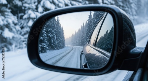 A snowy road captured in a car's side mirror, showcasing winter's chill and beauty.
