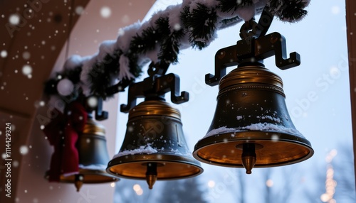 bell, snow, garland, winter, festive, decoration, christmas, holiday, cold, atmosphere, celebration, metal, sound, tradition, joy, rustic, seasonal, nature, landscape, morning, calmness, beauty, warmth, community, cheer, culture, heritage, craftsmanship, elegance, charme, ambience, spirit, joyfulness, nostalgia, gathering, family, friends, light, colours, harmony, scenery, view, peaceful, event, design, artistry, serenity