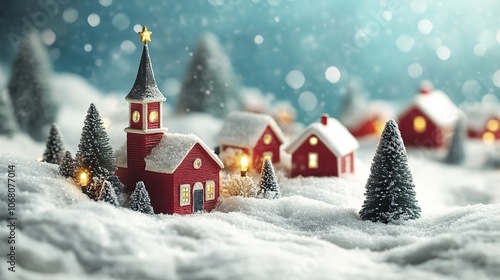 A snowy village scene with twinkling holiday lights and decorated trees symbolizes festive celebrations, making it ideal for holiday banners.