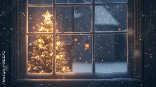 window, pane, glasses, snow, snowflake, falling, christmas, tree, pine, light, star, ornament, glow, night, winter, holiday, festive, season, cosy, home, warm, decoration, white, dark, blur, frosty, cold, outside, inside, sparkle