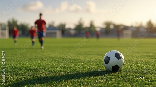 A soccer ball rests on the grass as players practice in the background during a sunny day at the field, creating a lively sports atmosphere.