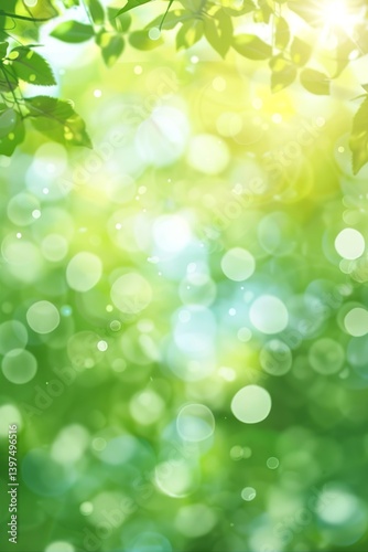 A soft, blurred background with a bokeh effect of green trees and sunlight filtering through the