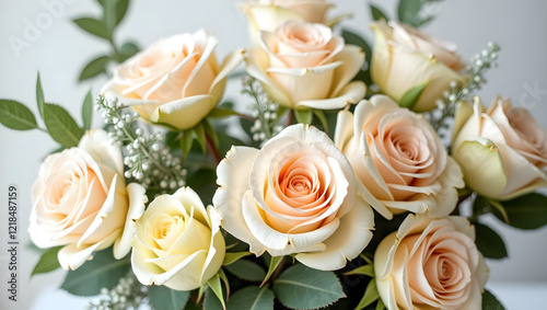 A soft pastel arrangement of white, peach, and pink roses, dusted with dew, interwoven with eucalyptus and silver mist, capturing serene elegance.