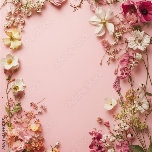A soft pink background with various flowers as a frame