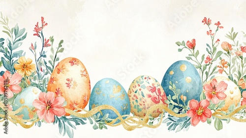 A soft watercolor-inspired Easter border with floral flourishes, painted eggs, and swirling golden ribbons enhancing the design.