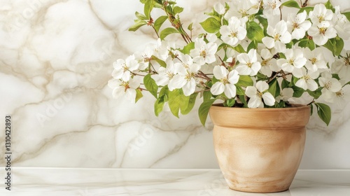 A soft-colored clay pot with delicate cherry blossom branches placed on a white marble surface.