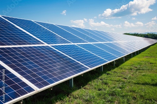 A solar farm with rows of solar panels under a bright blue sky, generating clean energy,