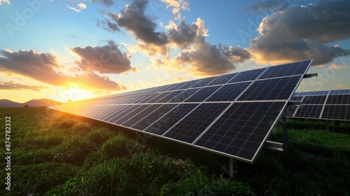 A solar tracker system in a large solar farm, with panels tilting to follow the sun's path, maximizing energy absorption, highlighting the innovation and efficiency of modern solar technology