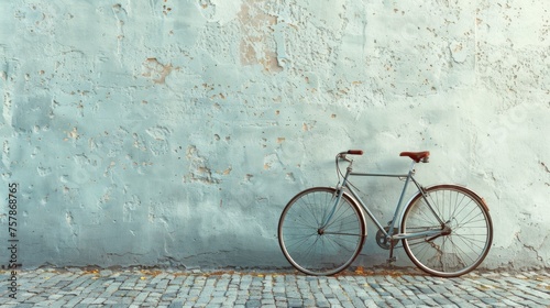 A solitary bicycle leaning against a plain wall, symbolizing freedom and simplicity in transportation,
