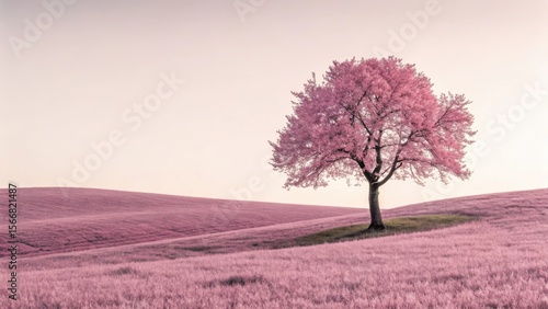 A solitary blooming tree with vibrant pink blossoms stands majestically on a rolling hill covered in soft pink grass under a pale sky