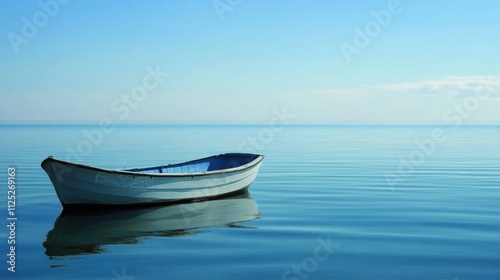 A solitary boat floats on tranquil waters, surrounded by serenity and open space, inviting thoughts and reflections amidst the calm. Generative AI