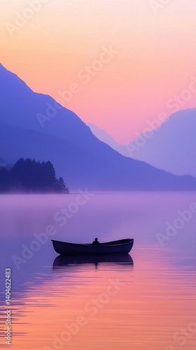 A solitary boat on a calm lake at sunset with mountains in the background