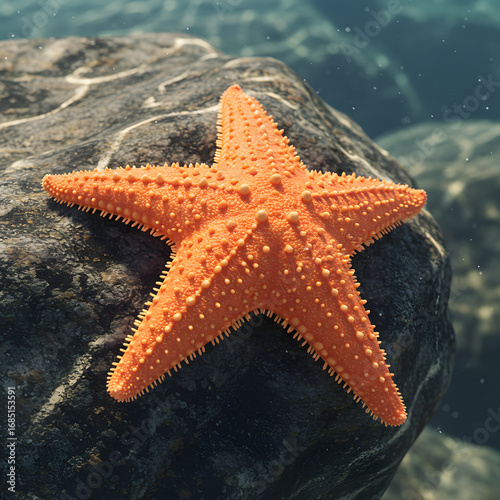 A solitary bright orange sea star rests peacefully on a rugged underwater rock in the sunlit ocean