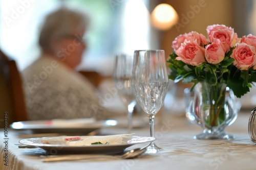 A solitary figure, an elderly woman, reminisces about the past while seated at a dinner table, surrounded by memories.
