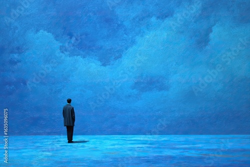 solitary, figure, huge, expanse, blue, vibrant, cloud, sky, man, contemplation, serenity, horizon, quiet, standing, coat, calm, thoughtful, peace, stillness, imagination, powerful, nature, art, painting, texture, colours, depth, impressionism, modern, emotional, solitude, perspective, landscape, dreamlike, abstract, impressionistic, wide, open, dramatic, quietude, expansive, huge, stormy, melancholy, hope