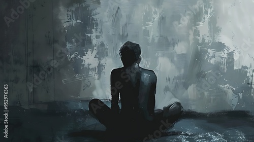 solitude, darkness, emotion, figure, art, shadow, light, wall, sitting, posture, depth, mood, expression, canvas, human, loneliness, space, contrast, design, silhouette, texture, creativity, thought, stillness, atmosphere, scene, visual, interpretation, mental, quiet, imagery, narrative, feeling, concept, perspective, colours, line, form, background, simplicity, essence, identity, connection, life events