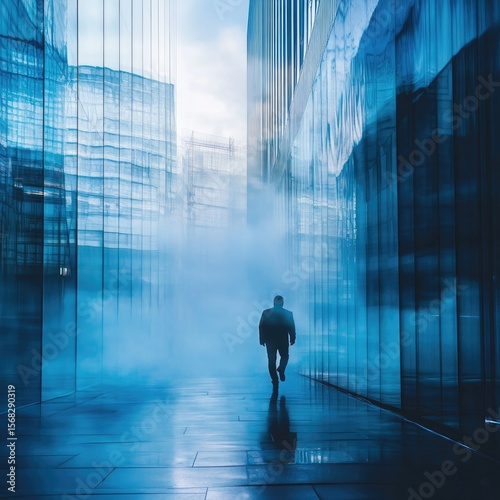 city, urban, pathway, modern, skyscraper, foggy, blue, haze, silhouette, figure, running, speed, movement, glasses, window, building, contemporary, commercial, business, exterior, empty, alone, paseo, street, pace, rush, commuter, sharpened, action, industrial, metropolis, urbanism, futuristic, fast, progress, individual, daylight, architecture, light, cold, calm, crisp, perspective, modernity