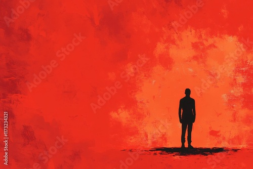 silhouette, man, red, background, orange, fiery, alone, standing, figure, person, landscape, textured, abstract, art, painting, digital, artwork, illustration, dramatic, intense, mood, atmosphere, emotion, feeling, desolate, lonely, isolated, sombre, serious, contemplation, shadow, ground, surface, colours, hue, shade, tone, vibrant, bold, powerful, energy, heat