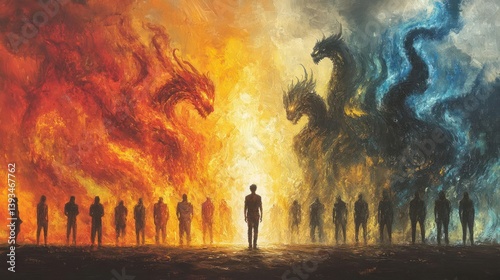 dragon, fire, ice, humanity, judgement, balance, conflict, fantasy, mythology, epic, chosen, destiny, sacrifice, power, mythical, spiritual, religious, supernatural, ancient, earth, apocalypse, end, begin, hope, faith, choice, confrontation, challenge, fate, soul, spirit, light, darkness, war, battle, creature, legend, symbolism, art, painting, digital, illustration, silhouette, crowd, standing, courage, fear, hopeful, powerful