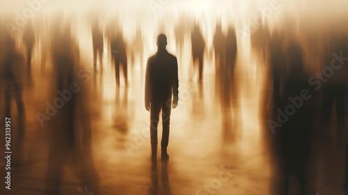 silhouette, crowd, warm tones, golden light, isolation, introspection, solitude, dreamlike, aethereal, hazy, soft focus, motion blur, anonymous, standing, mysterious, surreal, concept, human, alone, moody, pensive, contemplative, shadow, abstract, individual, contrast, lighting, urban, artistic, emotion, scene, backlit, mood, person, solitary, warm, mystery, surrealism