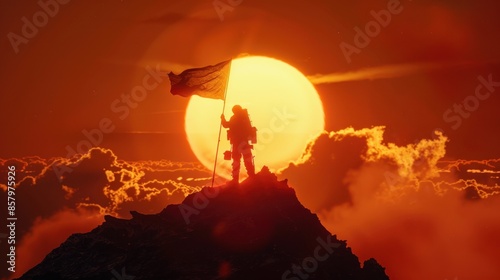 A solitary figure stands on a mountain's summit, flag unfurled in the dawn light. This silhouette embodies the spirit of triumph and the thrill of conquering challenges.