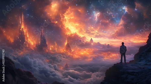 A solitary figure stands on a mountaintop overlooking a fantastical landscape of burning clouds, with a vibrant starry sky above.