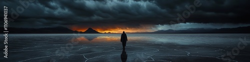 A solitary figure stands on a shimmering salt flat, surrounded by dramatic clouds and a vibrant sunset glow.