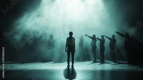 A solitary figure under a spotlight symbolizes scrutiny and judgment, reflecting cancel culture.