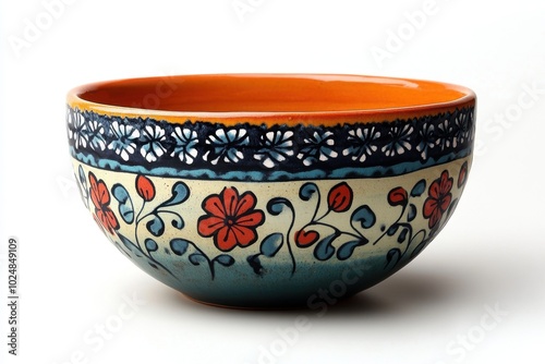 solitary, hand-painted, ceramic, bowl, vibrant, colours, honed, displaying, fruit, or, decorative, item, isolated, white, background