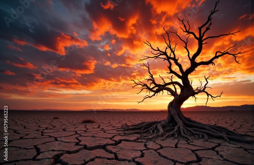tree, barren, dry, cracked, landscape, sunset, sky, cloud, orange, red, dramatic, twilight, silhouette, twisted, leafless, root, arid, desert, nature, scenery, wilderness, environment, horizon, evening, dusk, weathered, stark, surreal, peaceful, scenic, beauty, calmness, natural