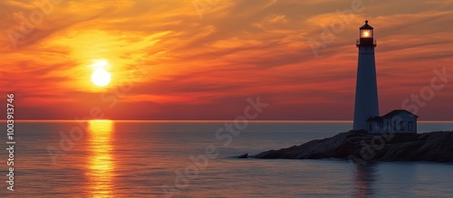 A solitary lighthouse stands tall on a rocky island as the sun sets over the horizon, casting a warm glow across the sky and the calm waters.