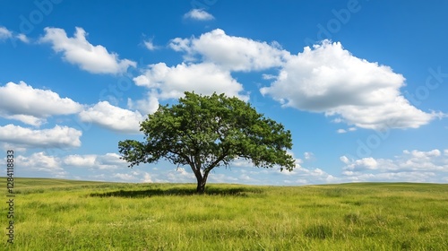 A solitary tree standing tall in a lush green field under bright blue skies and fluffy clouds : Generative AI