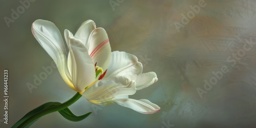 A solitary Tulip bloom unfurls to display rich stamen A single petal on the opposite side showcases a crimson stripe Soft focused green Tulip foliage envelops the flower The quintessential